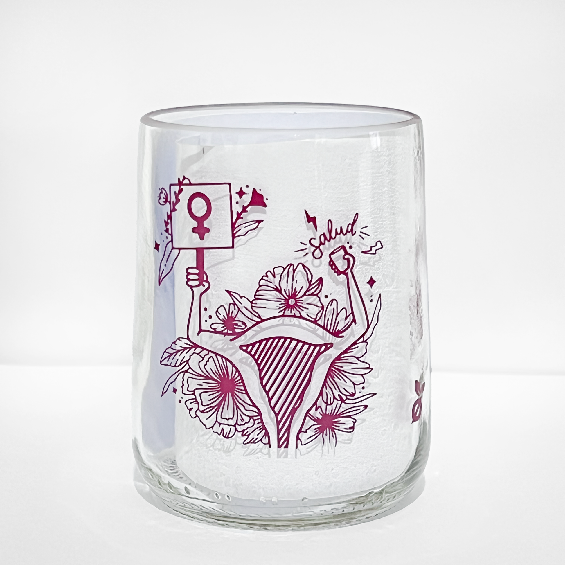 Este vaso de la colección Día de la Mujer combina diseño con propósito. Cada pieza está hecha a mano a partir de botellas de vidrio recicladas e intervenida con una ilustración que honra la valentía, la voz y el poder de las mujeres. Un detalle con significado que transforma cualquier brindis en un momento especial.