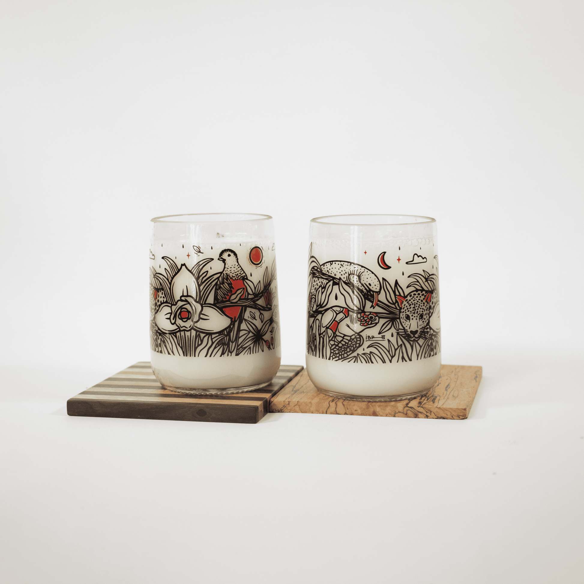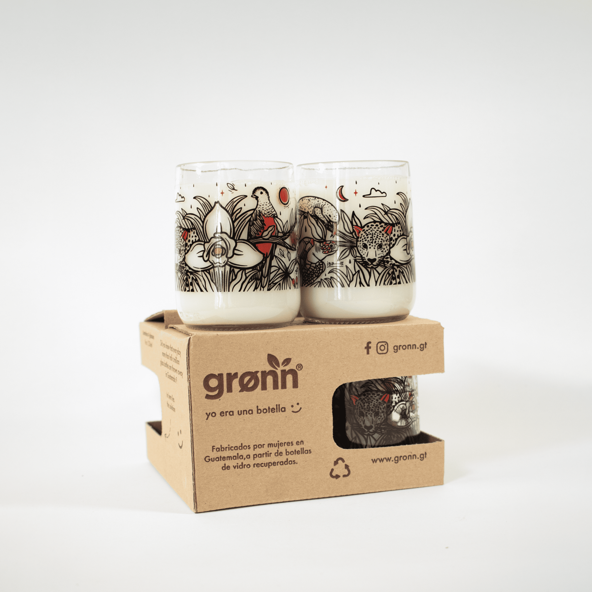 Cada set incluye 4 vasos con diseños de Abraham Mendoza, perfectos para dar un toque distinto a tu mesa 💚 o como un lindo regalo 🎁.
