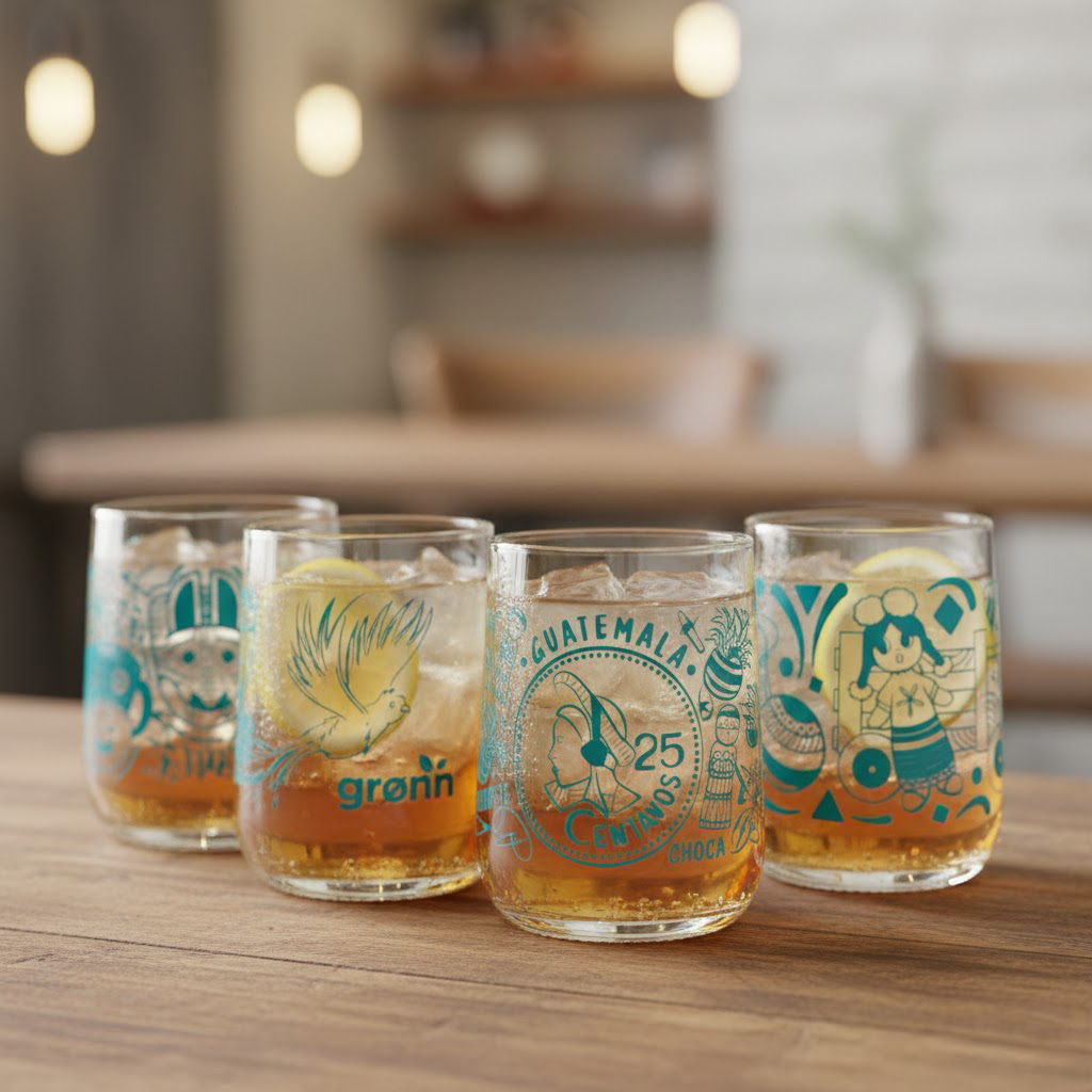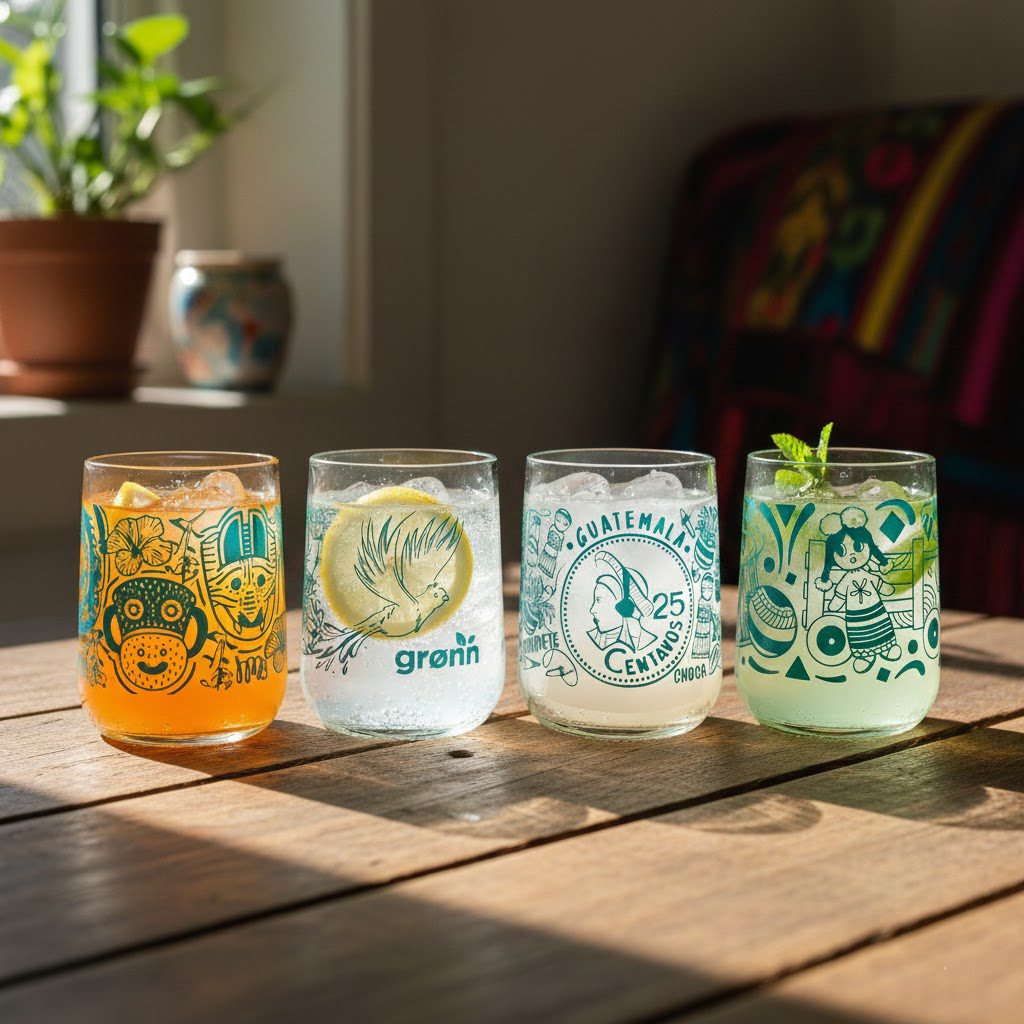 Este set de vasos de la Colección SumArte x Guate reúne 4 diseños diferentes creados por artistas guatemaltecos, impresos sobre vasos hechos a mano a partir de botellas de vidrio recicladas. Cada pieza es única y representa la unión entre creatividad, cultura y cuidado del planeta.